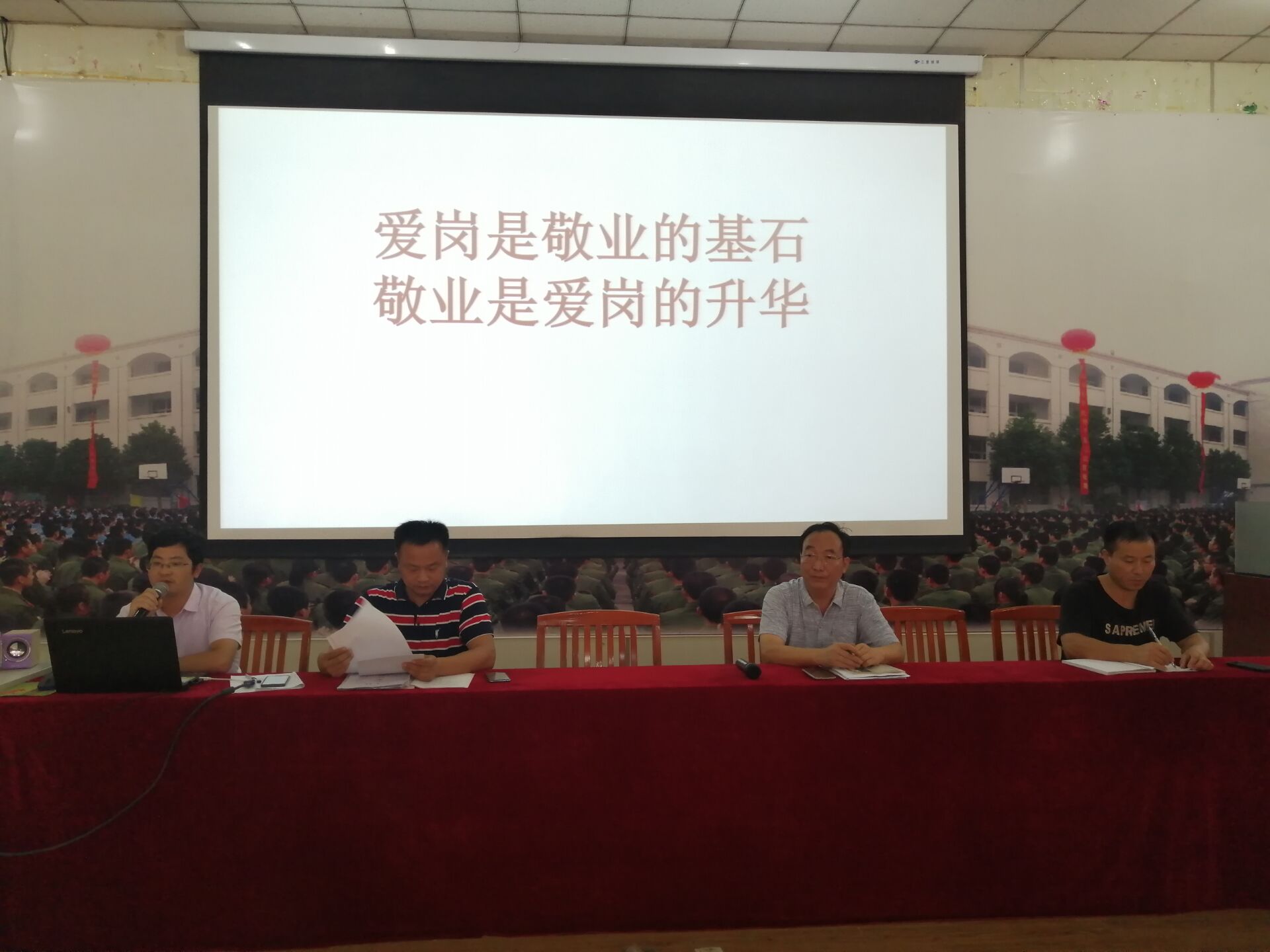 会上,朱主任首先向大家插播《感动中国-寻找最美乡村教师》视频,感受藏区教师阿力甫夏的感人故事。接着,播放本校日常教育教学中先后涌现爱岗敬业的真人事迹幻灯片,学习教师职业道德的三点内涵。