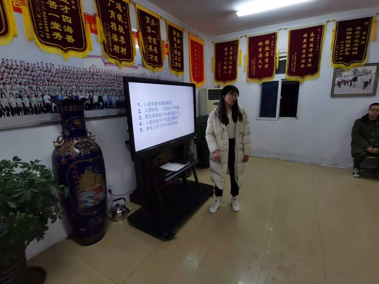 大会在嘹亮的《光荣啊,中国共青团》歌声中拉开序幕。大会分为两项议程:首先,由柳晓英老师带领团干共同学习了入团的要求、入团程序等共青团的基础知识。然后,八一党支部书记张家宝对全体团干提出了要求。张书记指出:团支部书记是学生队伍的中坚力量,要加强政治修养,学好本领、从德智体美劳等方面全 面提升自己,并在同学中间做好表率模范作用,同时他要求大家要树立“四个意识”,坚定“四个自信”,做好“两个维护”,各方面工作都要走在前列。