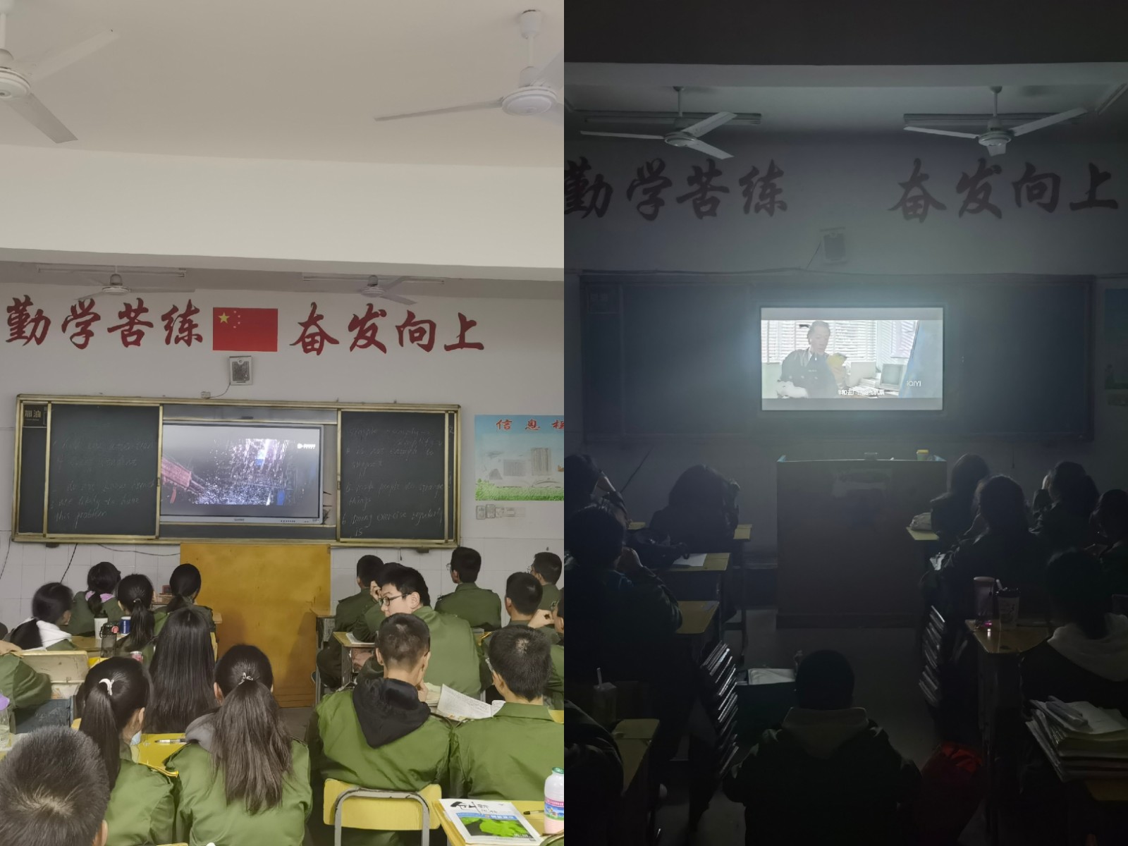 为弘扬抗“疫”精神,帮助学生树立正确的人生目标,培养爱国主义情怀。高二年级利用周六晚自习时间组织各班学生观看优 秀 抗“疫”电影。